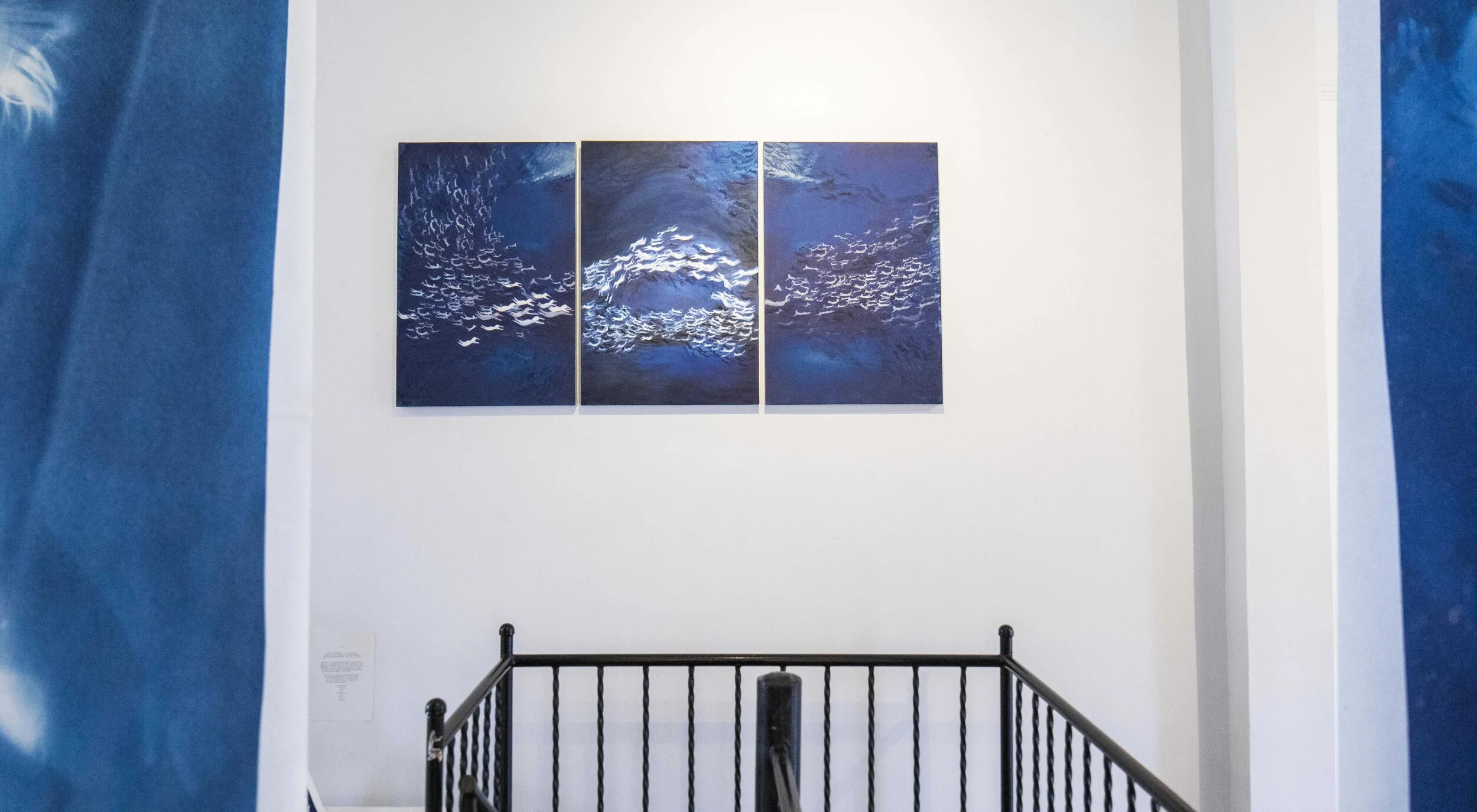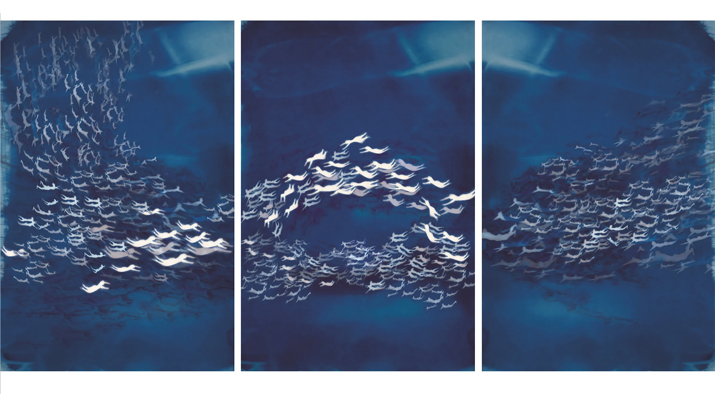 韩沁,迁徙时代(三联画),2018. 蓝晒,水彩,丝绸喷绘,228.6 x 152.4 cm © 韩沁,致谢否画廊