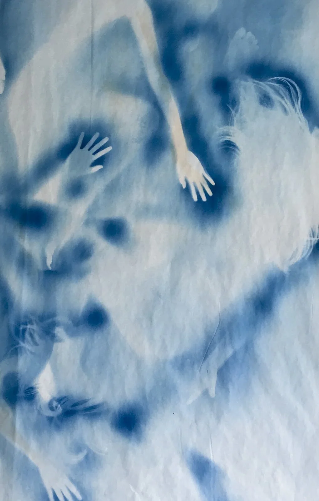 韩沁对于与迁徙变化相关的一系列问题都非常感兴趣。她的移民经历促使她思考自身与世界的相互关系,并在不断的身份转换中寻找动态稳定。与之前关注群体状态的作品相比较,在她最近的大幅蓝晒作品《演·化》中,个人意识、自我表达开始变得强烈。在208.3 x 119.4 cm的大尺幅画面中,人的身体形象以变化多端的姿态呈现于纸面上。一些部位例如手或头发有着清晰而果断的轮廓,而另一些部位又模糊在了仿佛是运动带来的飘渺影像中。这一系列作品带有明确而强烈的挣扎感,显然更加指向个体的经验和思考,而非宏观的群体精神。并且,时间叠加的痕迹也在这一系列作品中变得非常显著。
