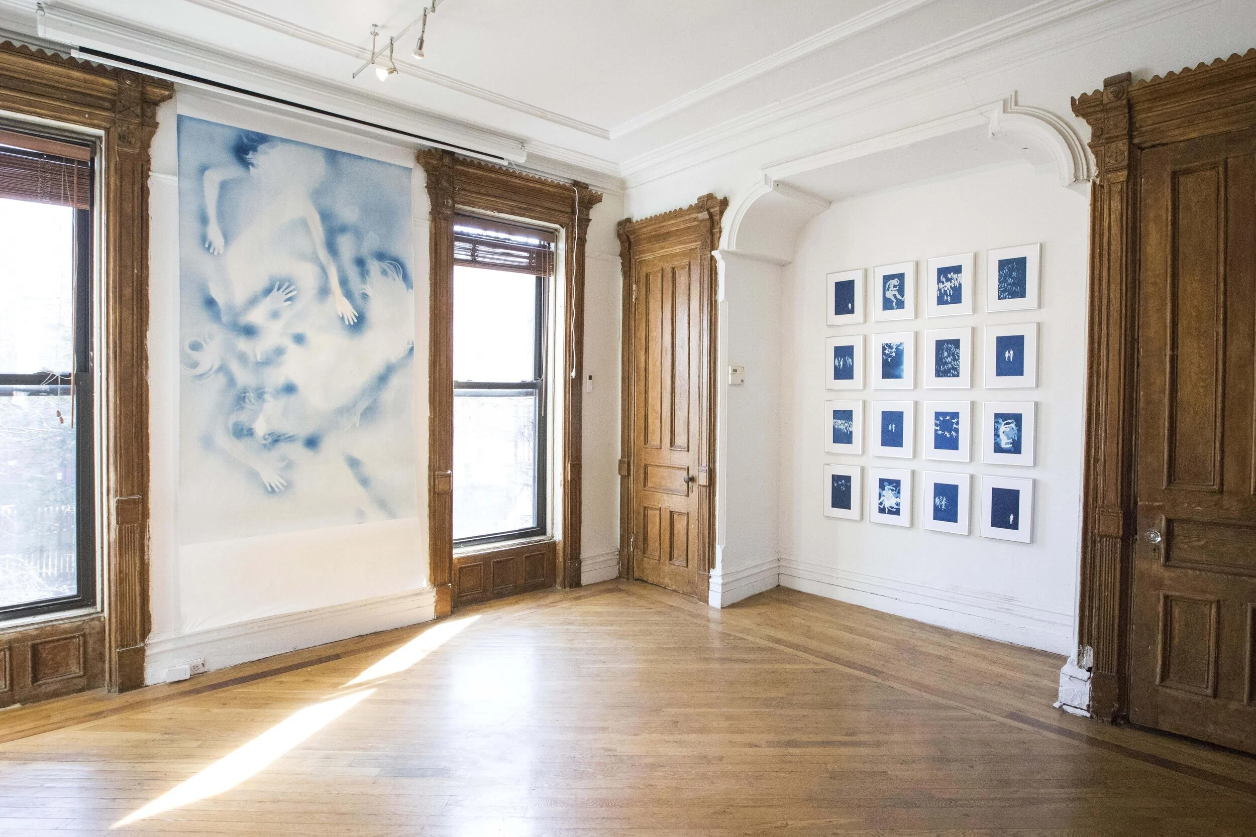 在展览构思中,以空间组织最好地呈现作品的精神内核,令观众在进入空间的瞬间就能够进入艺术家所创造的语境,是布展非常重要的考虑因素。因此,如何在画廊中营造出具有不确定性和灵性的氛围,以最恰切地呈现韩沁作品的思考,是布展的一个主要挑战。起初,大幅蓝晒作品是悬挂在空中的,但它们的摇晃程度过于剧烈。经过许多尝试,最终确定将它们的底部固定在地板上。当观众走进这个空间时,空气的流动会引起蓝晒作品一定的振荡,这种效果完美地表达了韩沁作品中不确定性的程度。