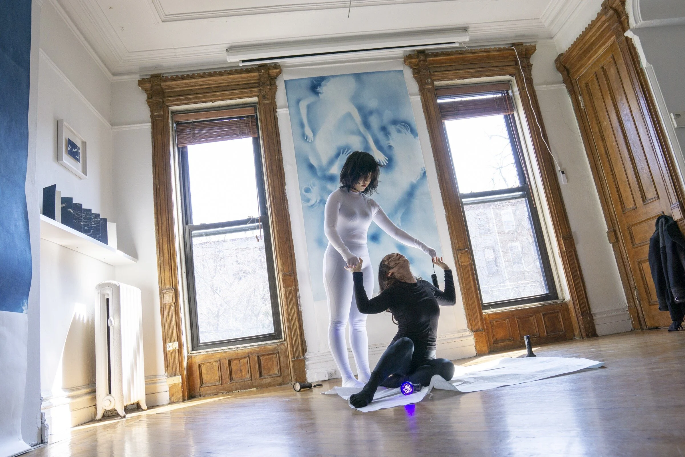 《演·化》蓝晒作品另一个有趣之处是其充满仪式感的创作过程。人的身体的动态作为发挥和表达的媒介,在纸面上被曝光所记录下来的种种瞬间其实只是整个创作的一部分。若能完整地目睹整个过程,获得的艺术体验会更加生动立体、更加难忘。即兴环境舞蹈《描摹白影》就是基于这样的想法创作出来的。从行为表演艺术的角度和方法出发,《描摹白影》对大尺幅蓝晒的创作过程进行了诗意的演绎和再现。以创作的具体过程作为叙事基础,即兴舞者与艺术家、策展人一起进行了充分的沟通、合作,根据画廊的场地、光线、空间布局,每场进行各不相同的即兴演出。舞者们从观众之中开始表演,当她们在纸面上不断挣扎、进行蓝晒曝光时,观众们在空间中观看并穿梭,自然地融入表演的空间。演出结束,即为一幅全新蓝晒作品的诞生,观众成为了实际艺术创作与行为艺术表演的交汇的见证人。