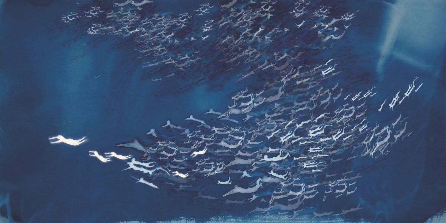 Han Qin, The Age of Migration 1, 2018. Cyanotype, watercolor, inkjet print on silk, 28 x 56 inch ©Han Qin, courtesy of Fou Gallery