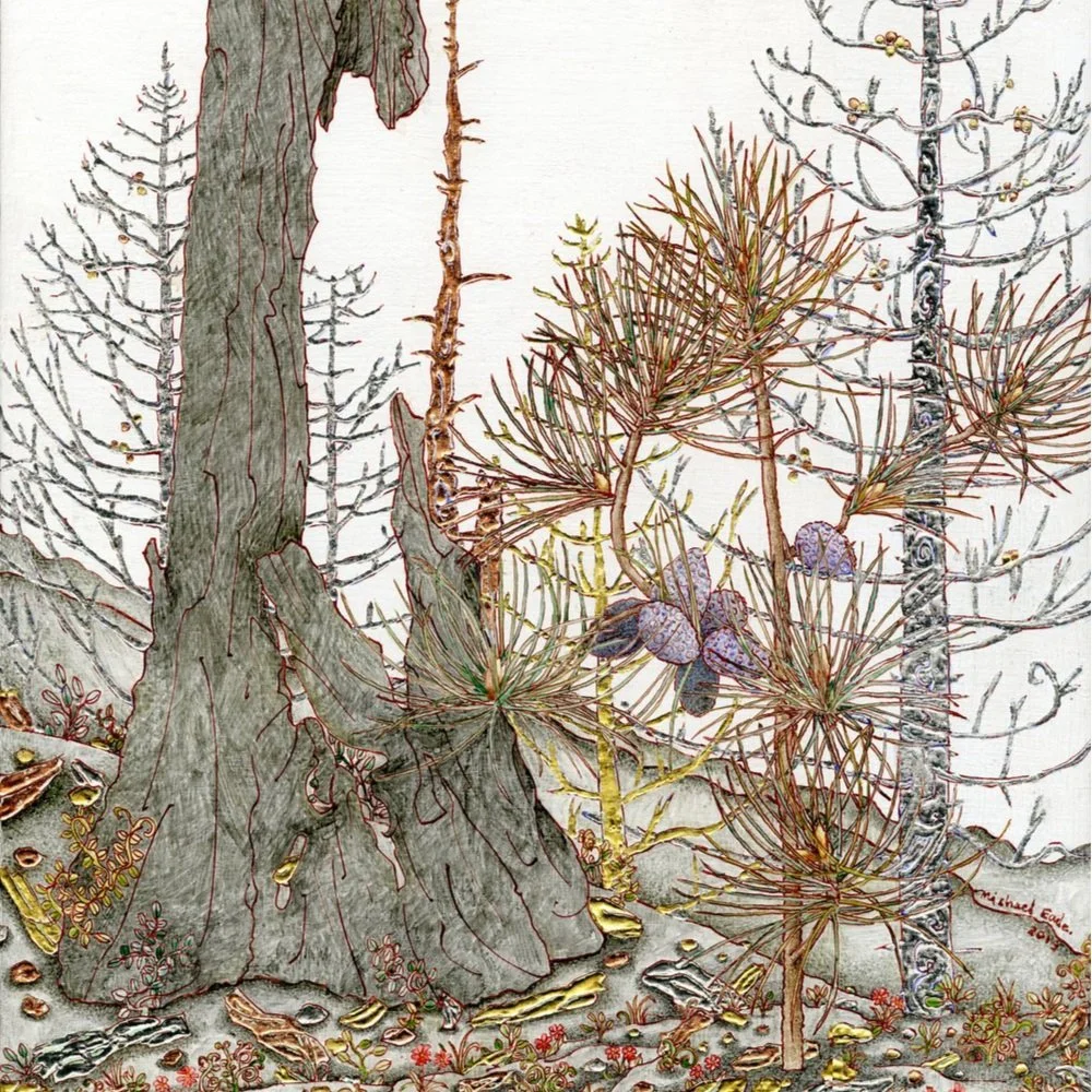 Michael Eade, Pine Tree Sapling (Small) (part), 2019. Egg tempera, raised 22k gold leaf, raised copper and aluminum leaf on wood panel, 17.1 x 13.8 inches ©Michael Eade, courtesy of Fou Gallery