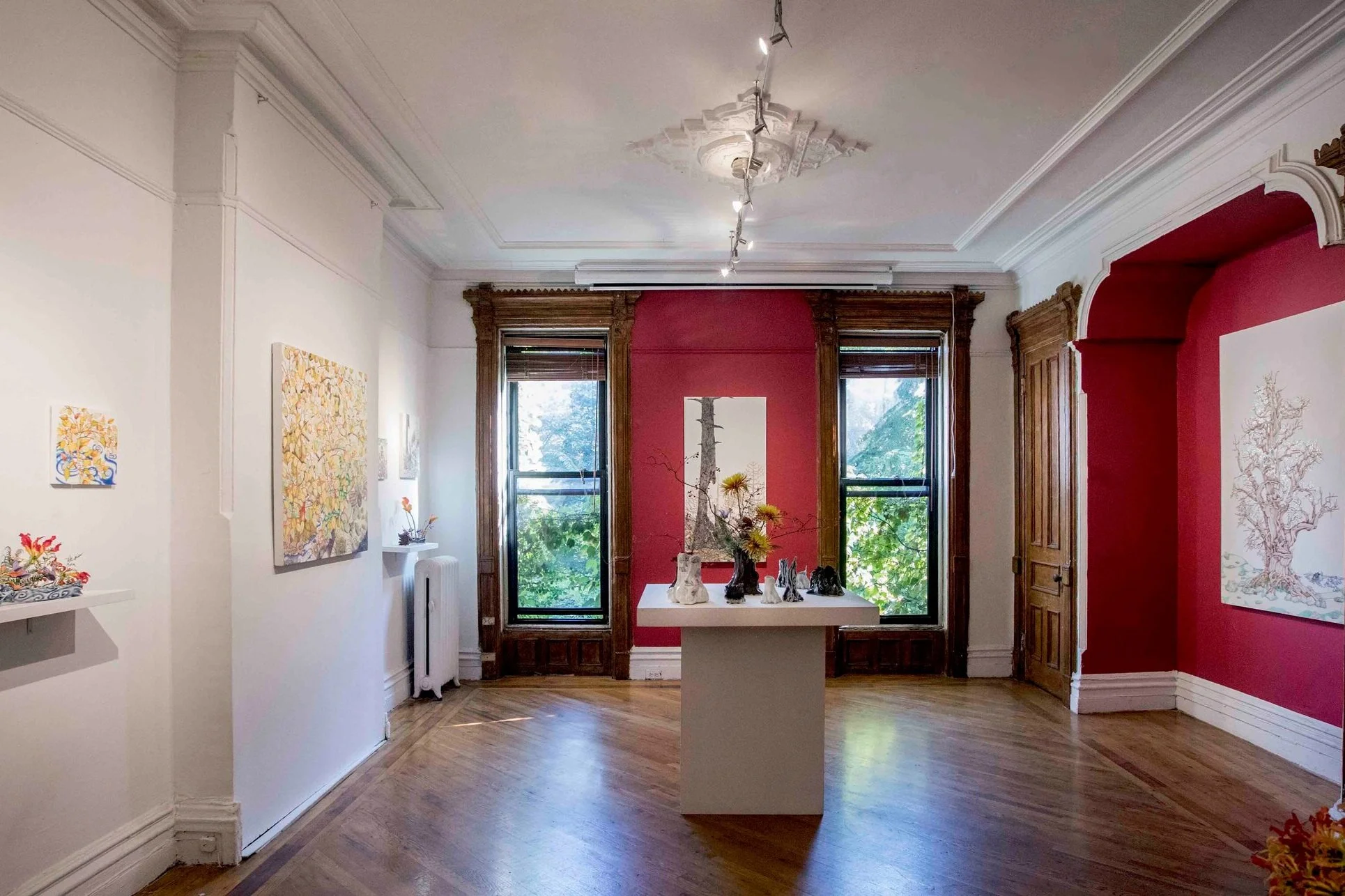 在伊德创作的“哺木”系列陶瓷作品中,从过程到结果更是凝固了充满灵感的偶然性和随机性。这一系列的雕塑的形象仿佛是从他的蛋彩画中浮现出来、变为现实,而由于陶瓷塑形和烧造过程中的不确定性,每一件又有着独特的色彩、形状和纹理。在位于否画廊的展览现场,花艺设计师叶子以伊德的“哺木”陶瓷为花器,以“自然乌托邦”为主题进行了“生花”流派的花道创作。“生花”插花艺术的风格与伊德的创作思想十分契合,尊重植物的本性和姿态,意在创造宽宏的意境与深邃的内涵,花材用量少、姿态简洁,以花与枝叶的盛开、待放、含苞代表过去、现在、未来。这也是对展览主题“刹那之间,过去即现在即未来”的完美点睛。