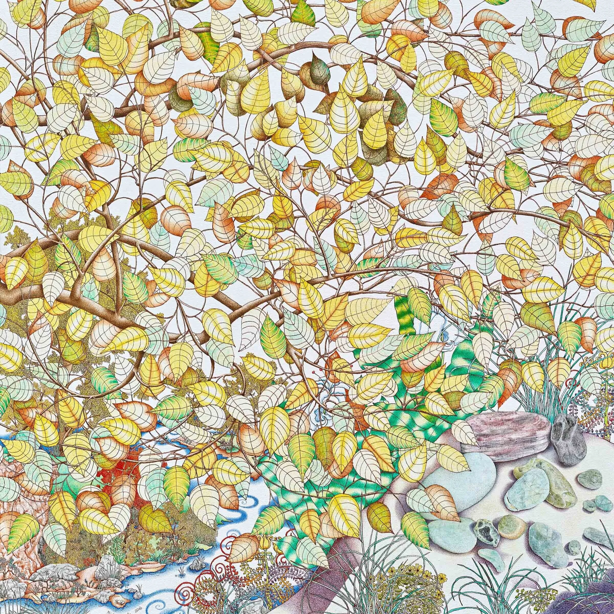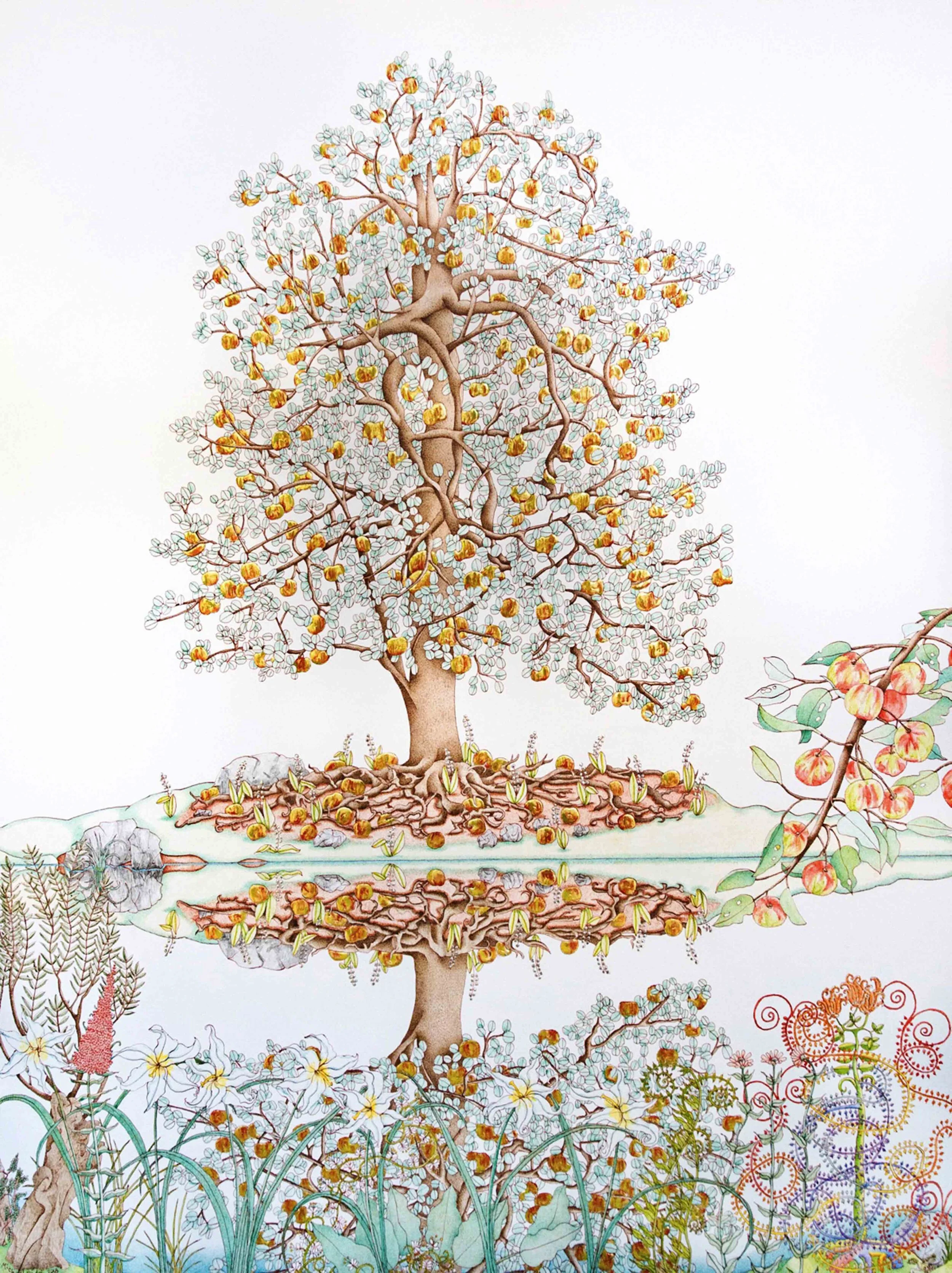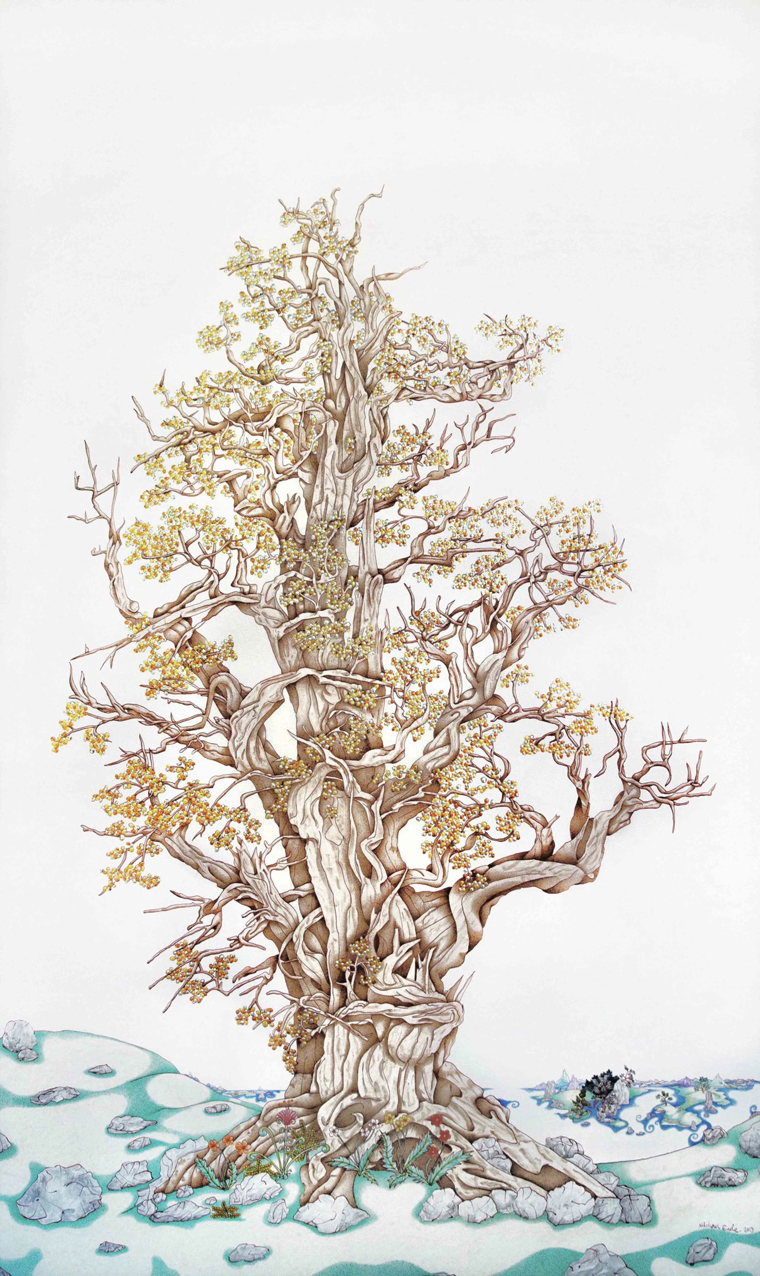迈克尔·伊德,生命之树倒影,2018. 布面蛋彩画及22k金叶,铜铝叶,122 x 91.4 cm ©迈克尔·伊徳